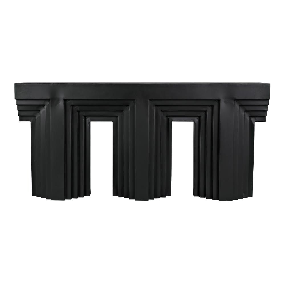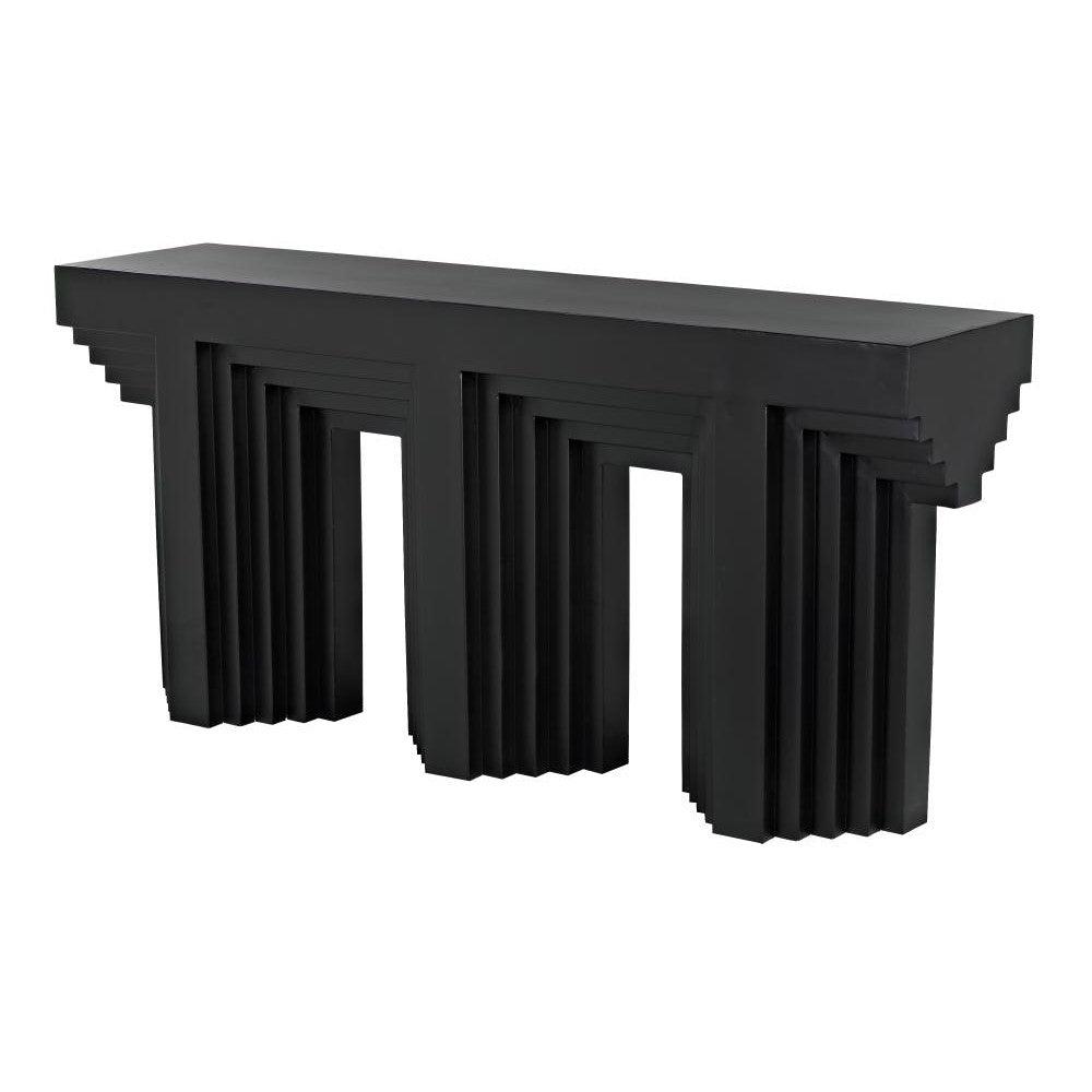A dazzling display of design virtuosity, the artisan crafted console table features industrial steel, finished in a beautiful matte black. Measures 30"H x 64"W x 15"D.