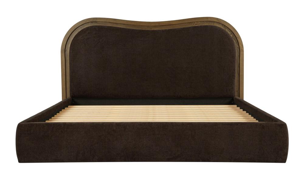 This bed is an art deco inspired take on the wave bed. Its solid ash wood frame exudes warmth with its mid-tone brown finish. The upholstered foam and fiber headboard is thoughtfully designed, featuring a stepped-down or inset frame technique that skillfully creates a captivating wave effect. Polyester upholstery over foam & fiber filled headboard. Mid-tone brown color solid ash wood frame. Supportive slats are included with this design to ensure the mattress doesn’t sink or slide, no box spring necessary. Assembly required. Measures 50"H x 86"W x 88"D.