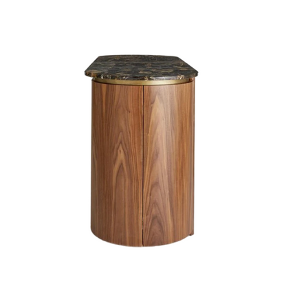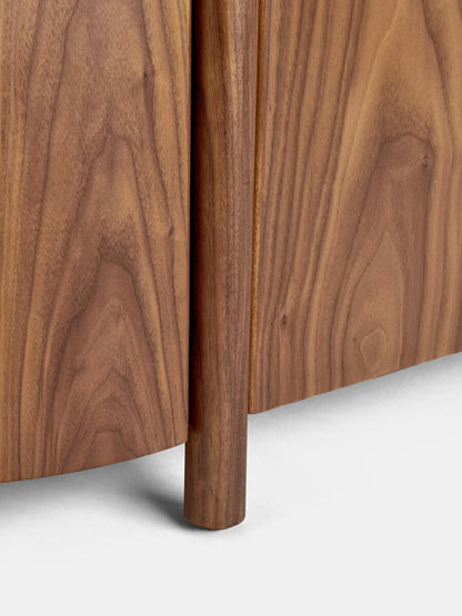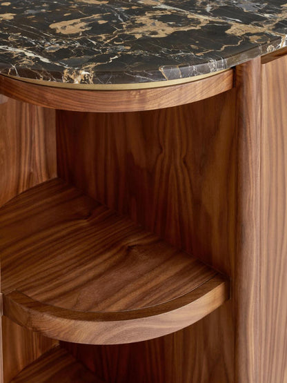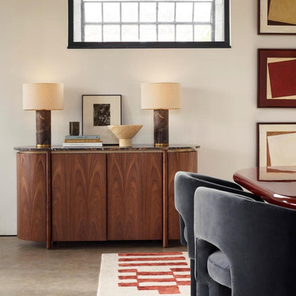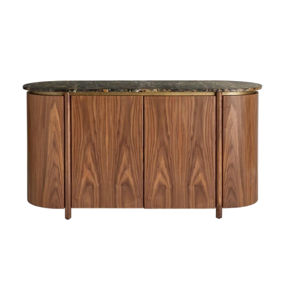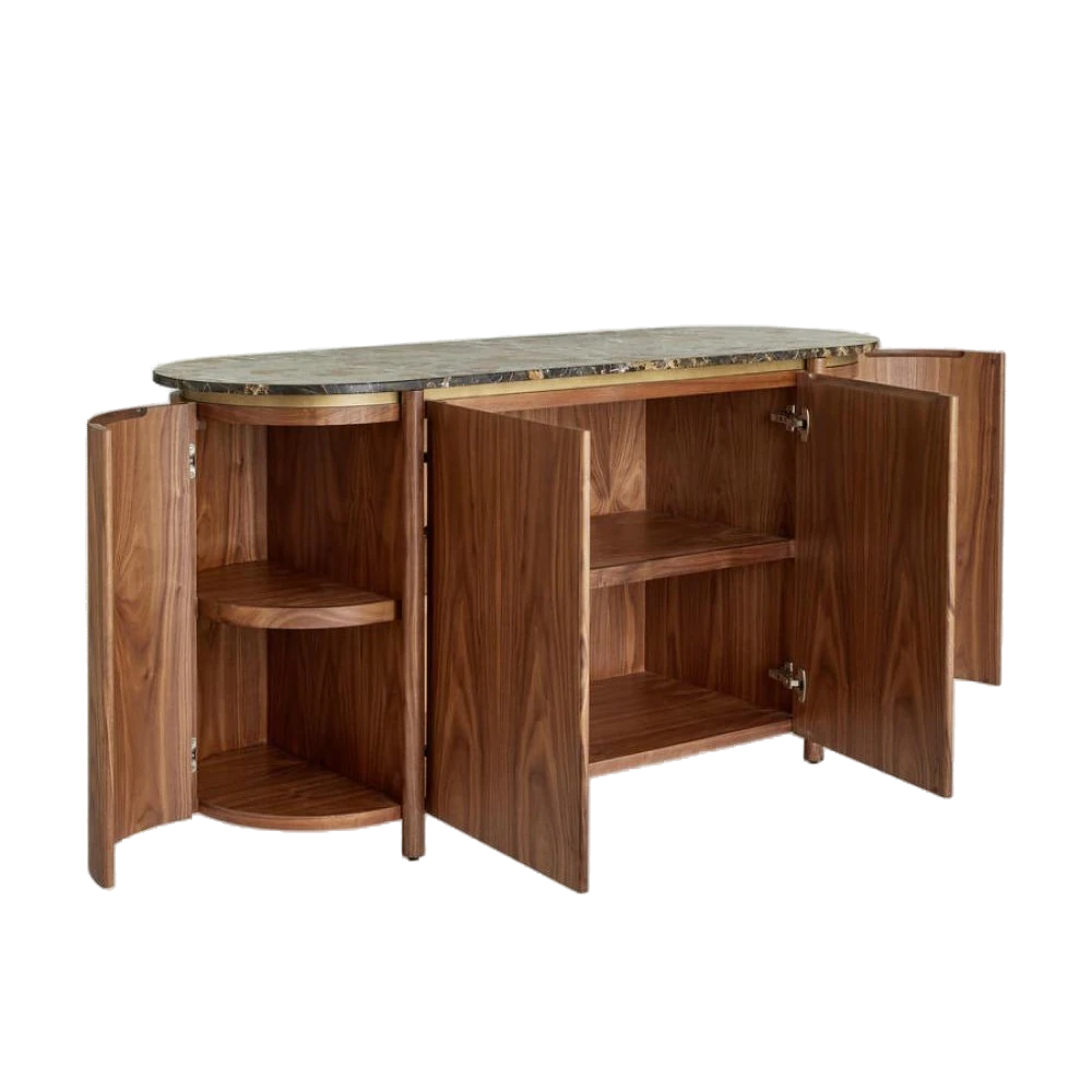 This statement sideboard contrasts dark walnut wood with a honed Michelangelo marble top. Sourced from Pakistan, this dramatic black and rust marble varies in characteristics, making no two designs the same. Antique brass finishes further elevate this piece, while four soft close doors and hidden recessed handles mean you can stow away your essentials in modern and functional style. Inspired by Soho House Rome.