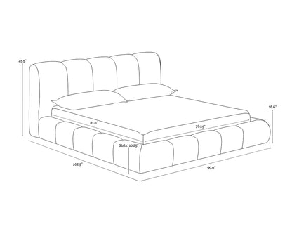 Embrace the luxuriously plush coziness of this modern bed. A true statement piece that is generously cushioned and upholstered in an ash gray smooth velvet fabric with vertical channel tufting. Inner Dimensions: 61" x 81.5". Measures 47"H x 84.30"W x 104.80"D.