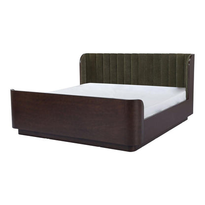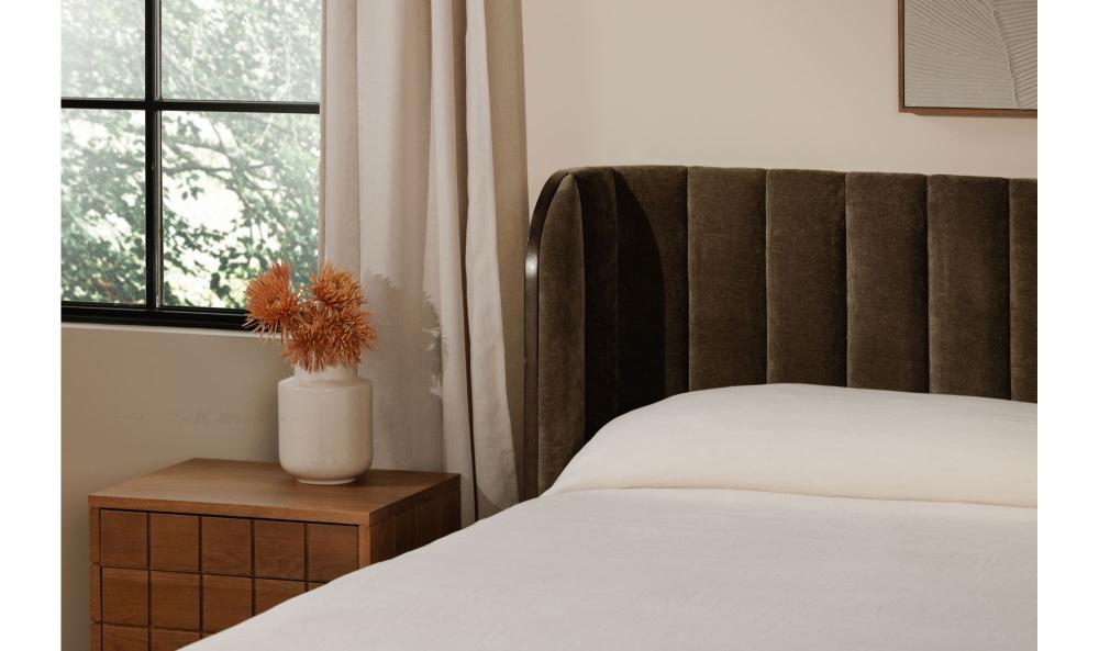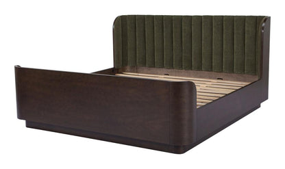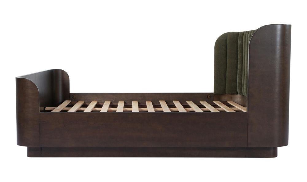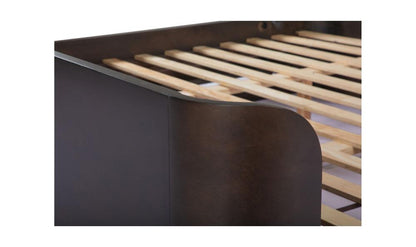 This bed's classic sleigh design features soft polyester upholstery and a dark brown birch veneer frame that transforms any bedroom into a cozy retreat. Its foam and fiber headboard curves forward in a cocoon-like shape, offering a warm, enveloping embrace perfect for reading and relaxation. Dark birch veneer over MDF frame with rubberwood base. Foam & fiber headboard. Supportive slats are included with this design to ensure the mattress doesn’t sink or slide, no box spring necessary. Assembly required. Measures 37"H x 63"W x 85"D.