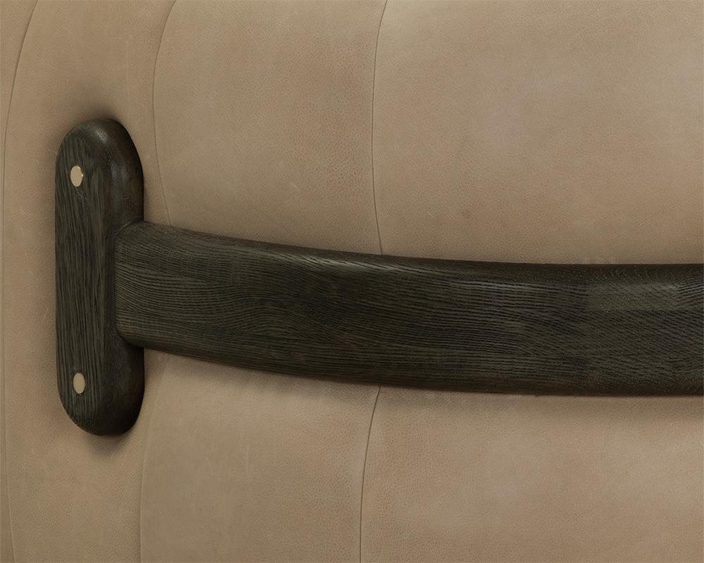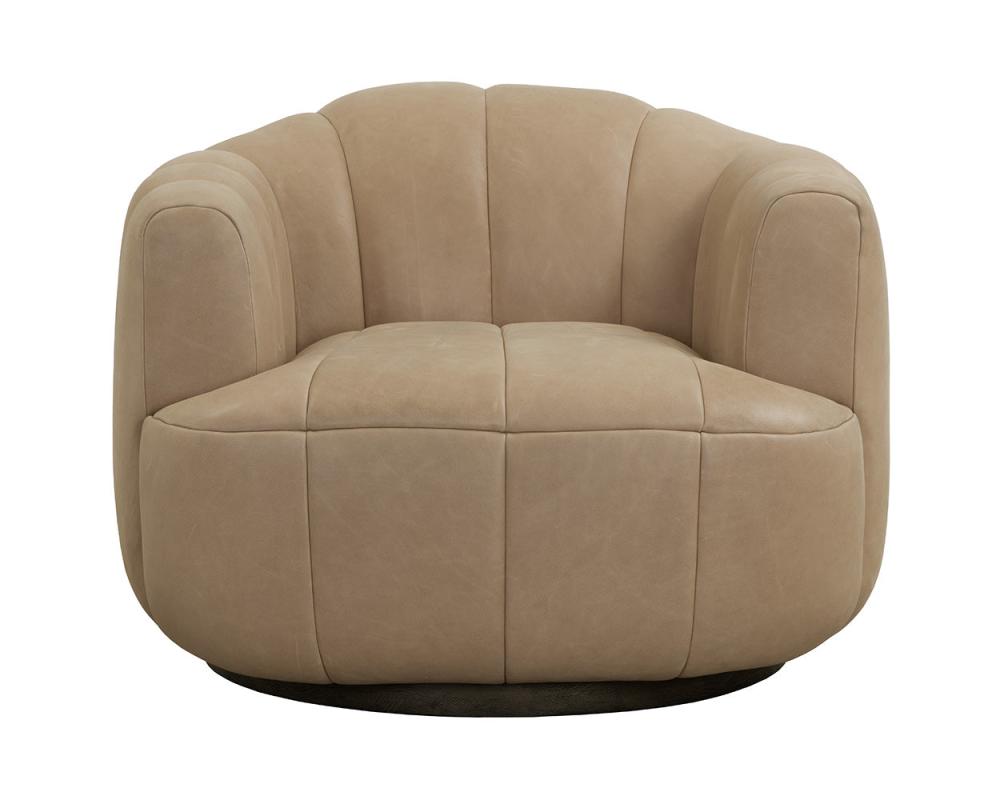 With its shapely silhouette and bolstered seating, this swivel armchair takes comfort to a different level. A luxurious seat upholstered in a smooth light brown sand color top grain leather sits atop a solid oak wood base in a dark brown finish. Matching wood detailing along the back of the chair with antique brass accents give a playful yet coordinated look to the design. Crafted with 100% genuine top grain leather. Leather is a natural material; as such, color variations, markings, wrinkles, grooves and light scratches are acceptable and appreciated characteristics. No two pieces are alike. Measures 29"H x 39"W x 38.30"D.