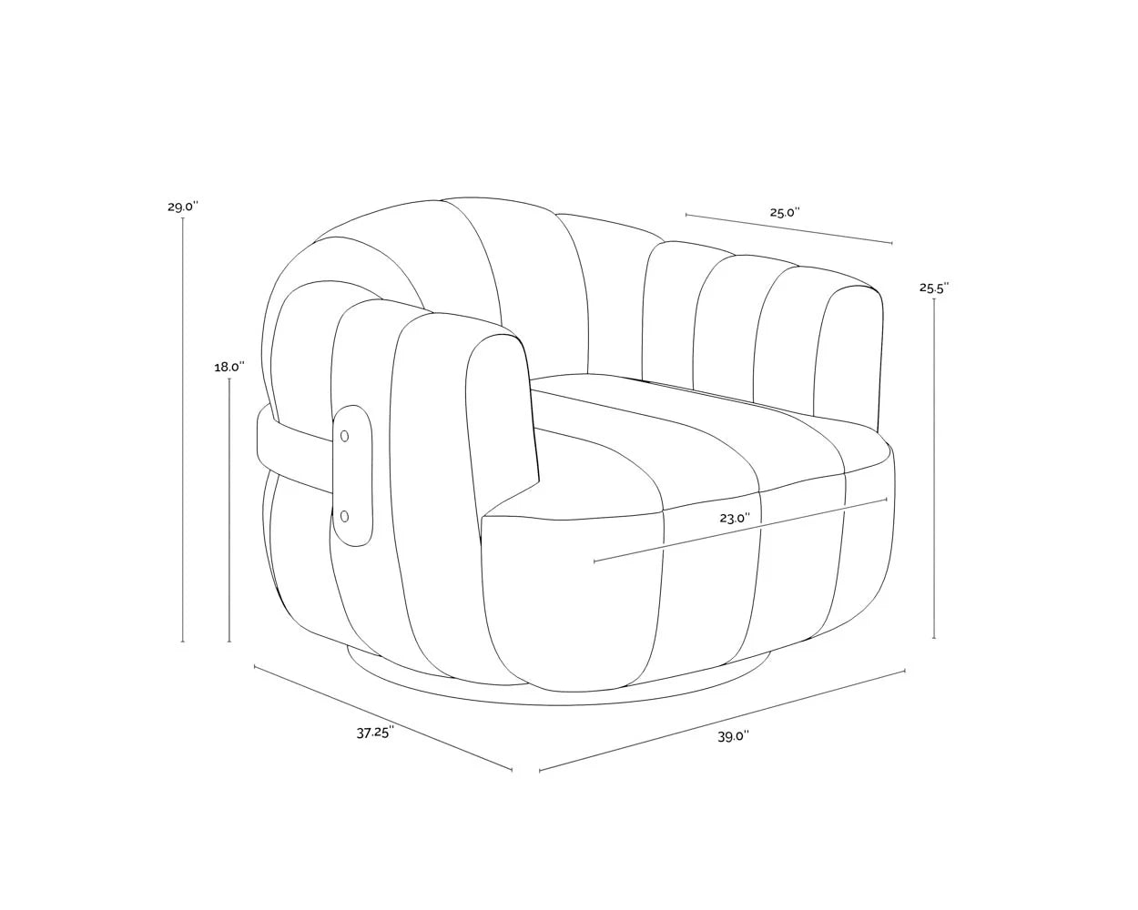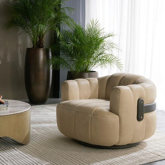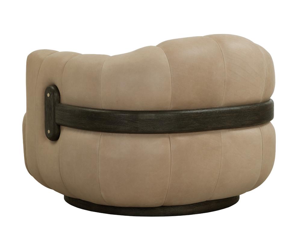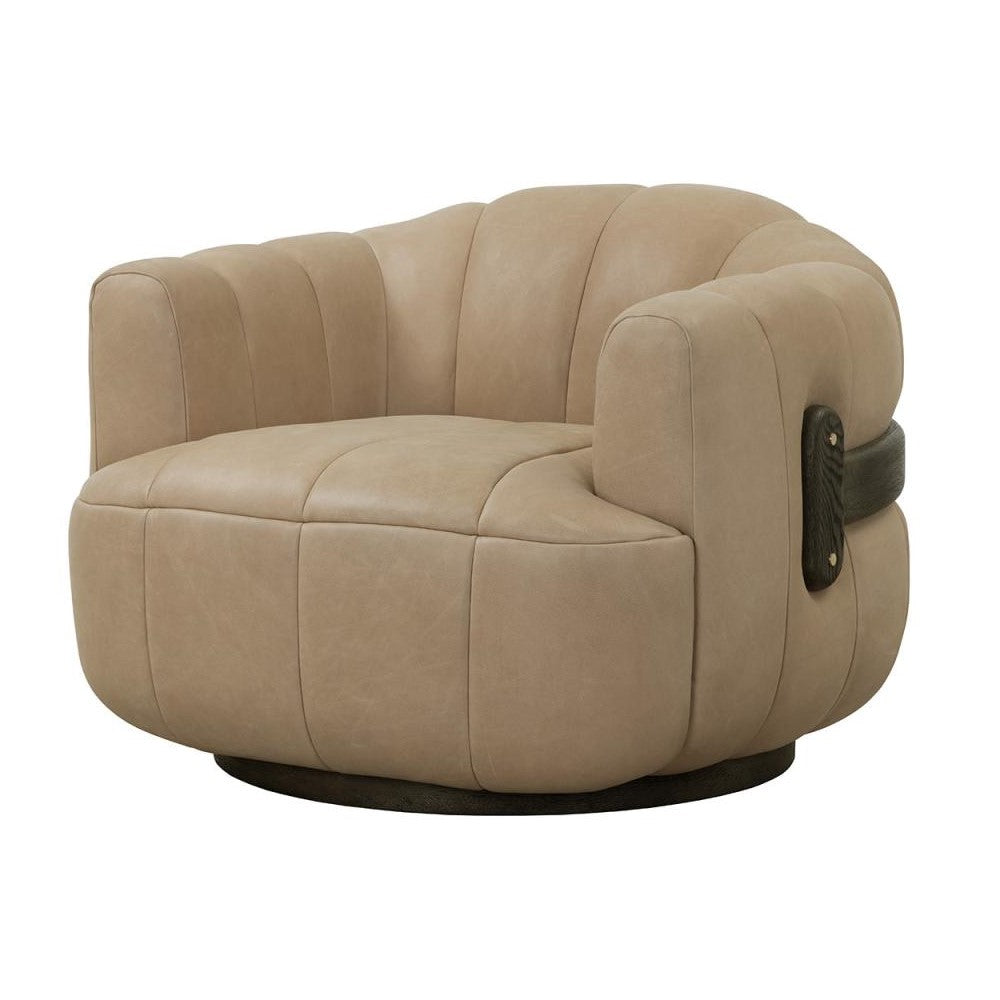 Channel Tufted Sand Leather & Brown Solid Oak Wood Swivel Armchair Lounge Chair
