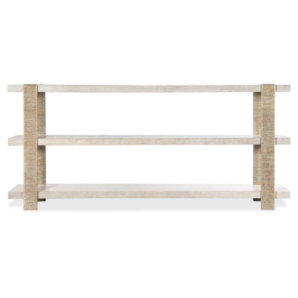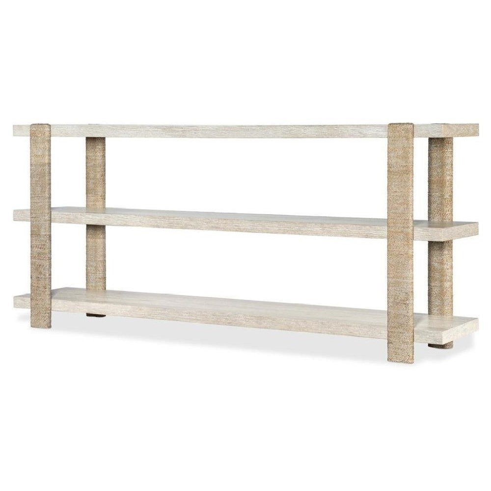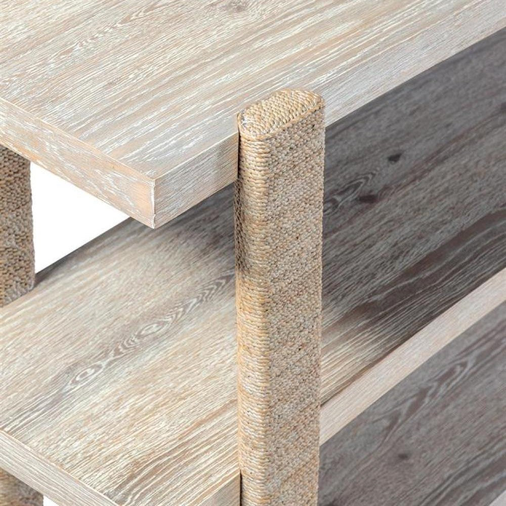 Crafted of oak veneers with an open grain pattern with rope wrapped supports, this console table has a light and airy natural wood finish, a tactile quality and a youthful vibe. Two fixed shelves with open sides and back. Measures 72"W × 32.5"H × 16"D.