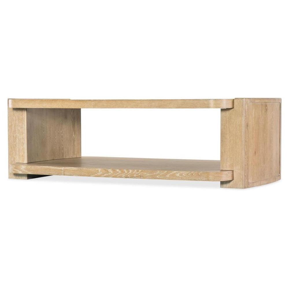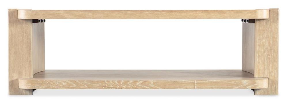 This rectangle coffee table has a tranquil personality with a modern twist. Simple, clean lines are in a rectangle shape with rounded corners and interlocking block-style legs. Crafted of Oak veneers, it is finished in sand colored dune, transparent by design to reveal the unique grain patterns of the wood veneer. One lower fixed shelf. Measures 58"W × 18"H × 34"D.