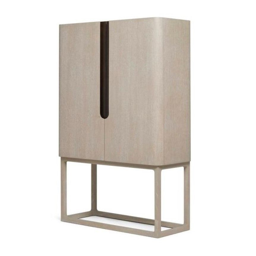 This modern coastal light Oak wood bar cabinet features clean curved edges. There is plenty of storage space for your favorite spirits and barware including three glass shelves and two interior drawers. The curved cut-out classic bronze aluminum hardware makes a striking contrast on the handsome high end bar cabinet. Measures 73"H x 48"W x 18"D.