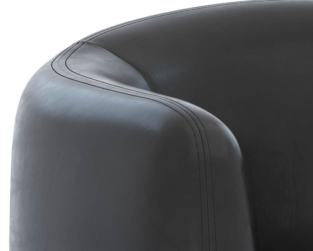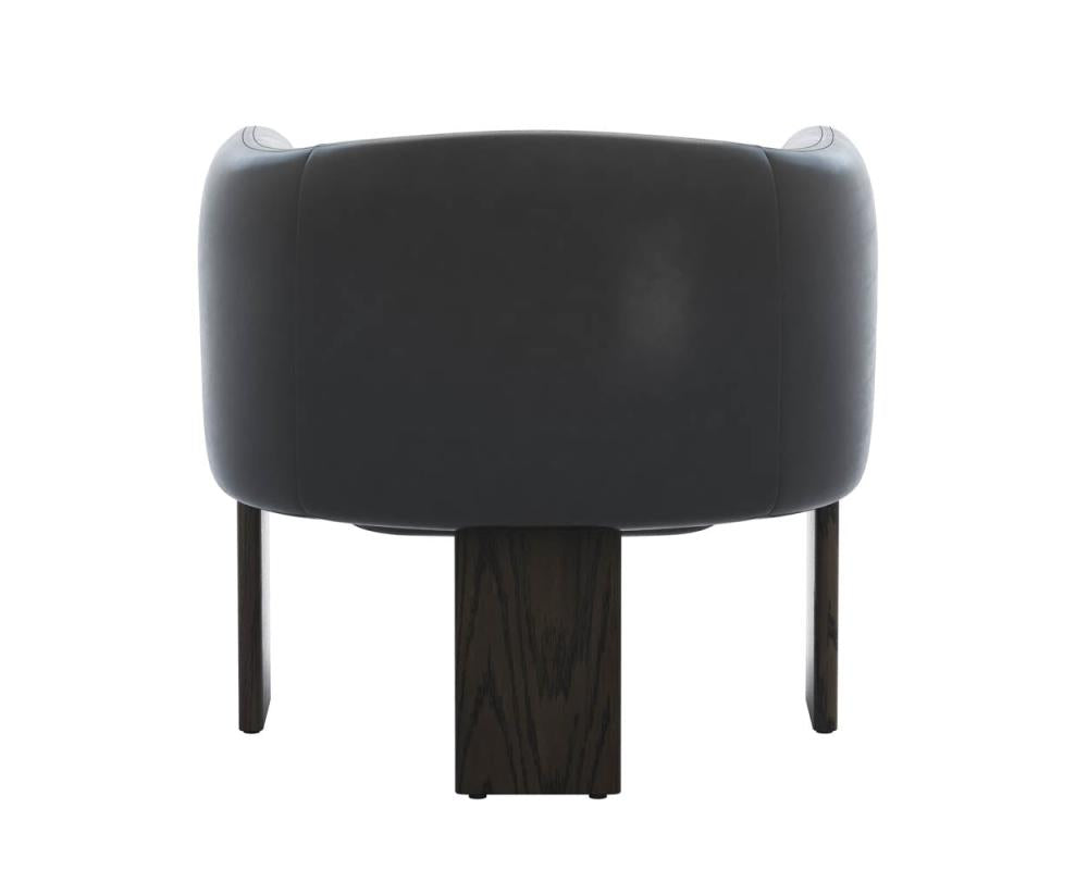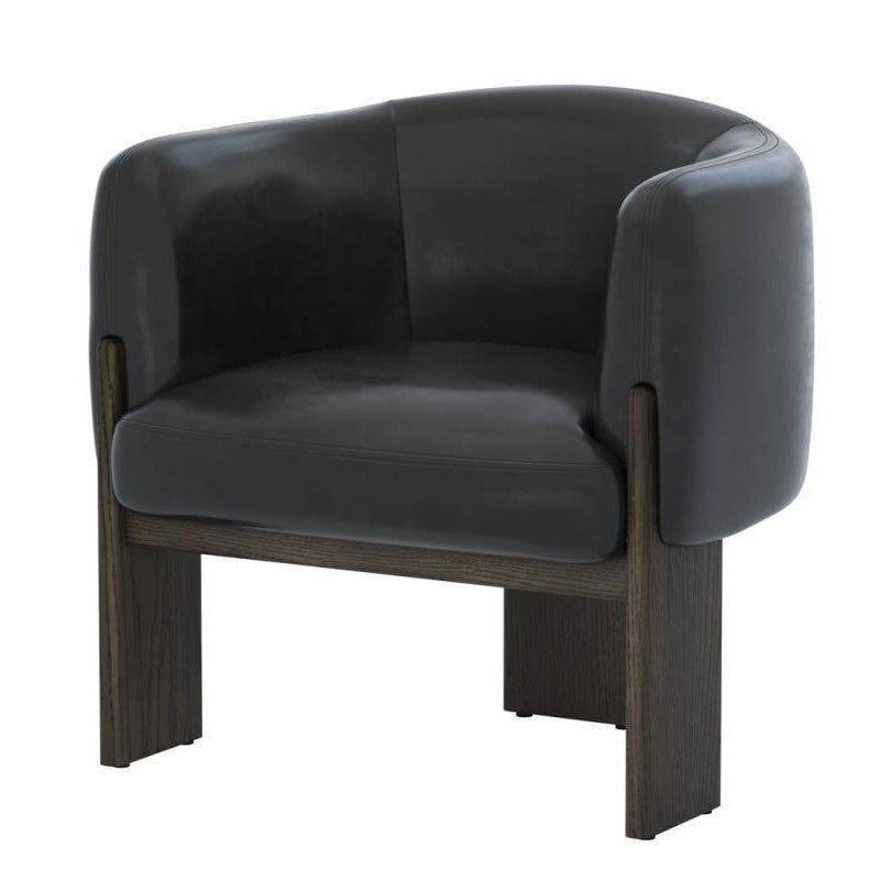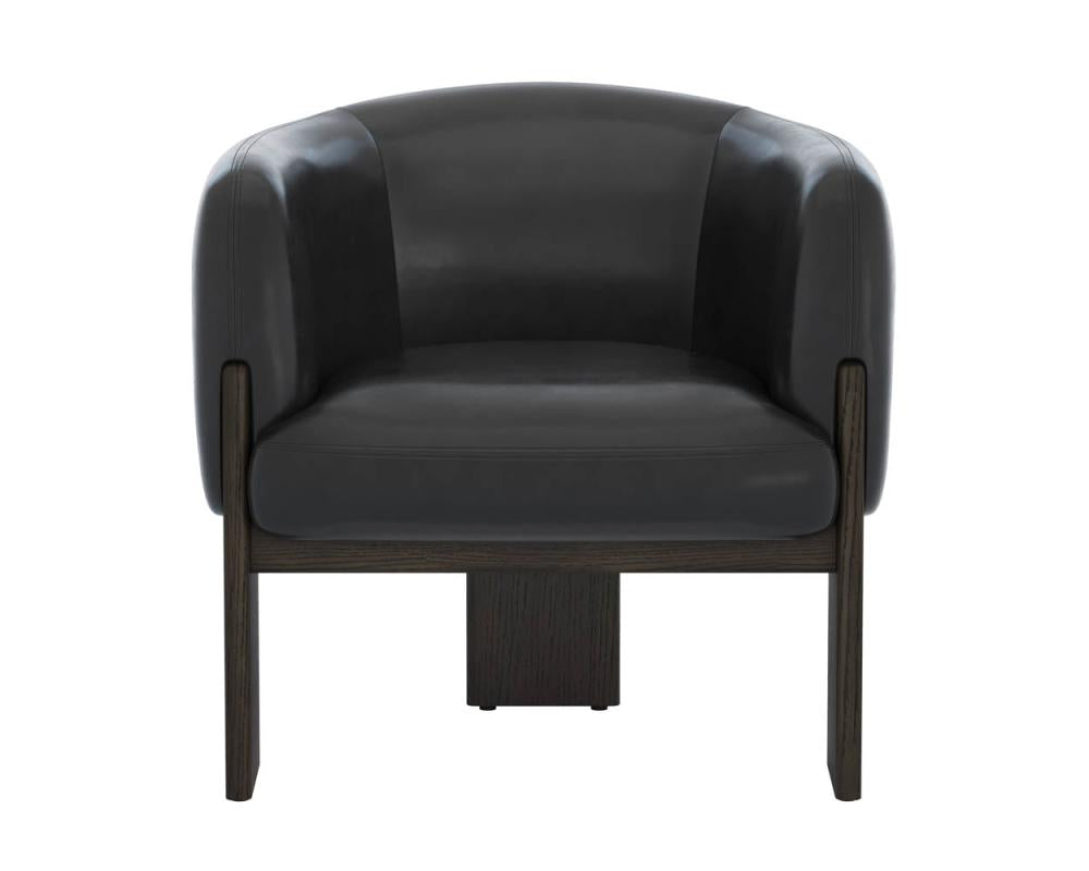 Embrace the luxurious comfort of this uniquely shaped lounge chair. Generously padded and upholstered in a stylish vintage black leather, this piece will complement any home aesthetic. Completed with a dark brown solid oak wood base. Webbing support provides flexible and resilient comfort. Solid oak wood legs feature a brushed finish for a uniform look. Seat cushion is filled with a combination of foam, fibre and dacron for unending support. Rounded back crafted with a supportive combination of foam and fibre. Seat Dimensions (W*D*H): 20.50" x 21" x 18.25". Arm Height: 28.5". Measures 30"H x 32.30"W x 27.80"D.
