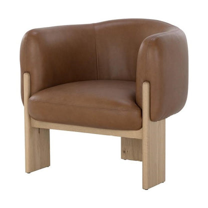 Embrace the luxurious comfort of this uniquely shaped lounge chair. Generously padded and upholstered in a stylish vintage camel brown leather, this piece will complement any home aesthetic. Completed with a rustic oak wood base with a cerused finish on the legs. Webbing support provides flexible and resilient comfort. Solid oak wood legs feature a brushed finish for a uniform look. Seat cushion is filled with a combination of foam, fibre and dacron for unending support. Rounded back crafted with a supportive combination of foam and fibre. Seat Dimensions (W*D*H): 20.50" x 21" x 18.25". Arm Height: 28.5". Measures 30"H x 32.30"W x 27.80"D.