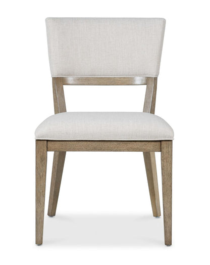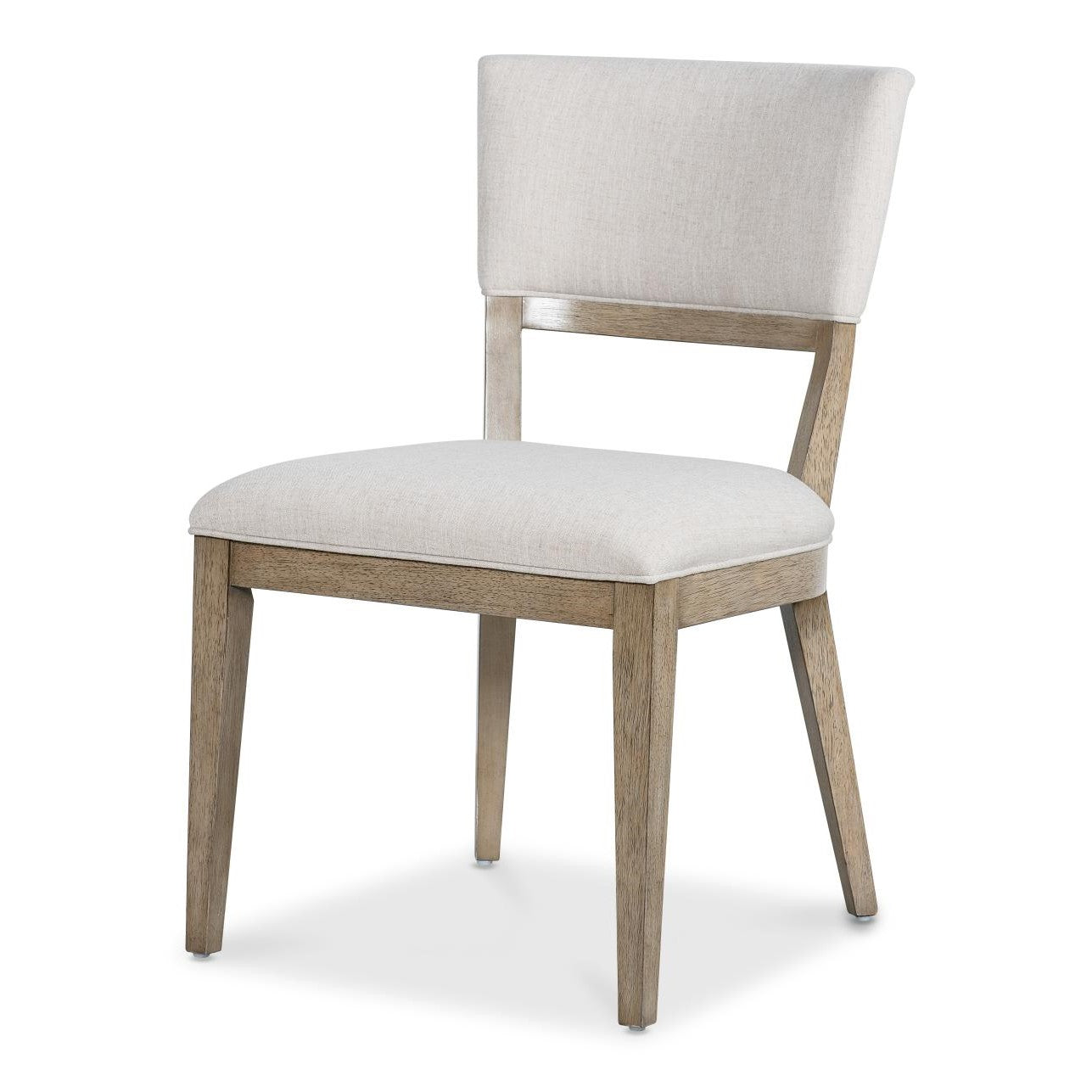 These elegant curved back armless dining chairs feature a neutral oatmeal color performance fabric and a white oak veneer frame in a light earthen-toned finish. Seat Dimensions (W*D*H): 22" x 20" x 20". Fabric contents: 92% Polyester, 8% Linen. Set as a set of 2. Measures 34"H x 21.50"W x 22.50"D.