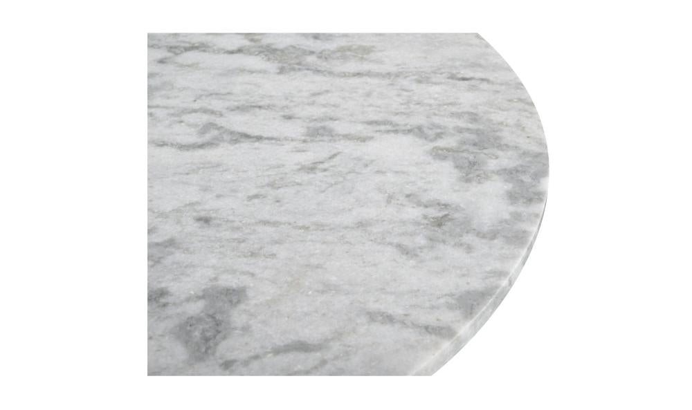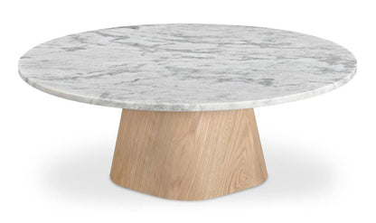 This low profile coffee table is a harmonious contrast of materiality and tactility, where a weighty base meets a visually light marble top. With five connected sides equipped with softened, rounded edges, the base assumes an organic appearance, its natural color subtly softening the marble top for enduring visual appeal. Variation in veining and activity of marble is to be expected; each will be unique. Crafted from Oak veneer over plywood with MDF & mix wood base. Measures 42"W × 42"D × 15"H.
