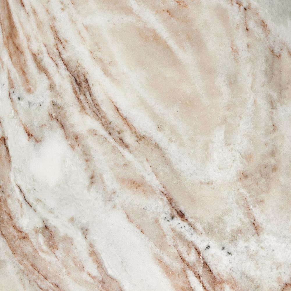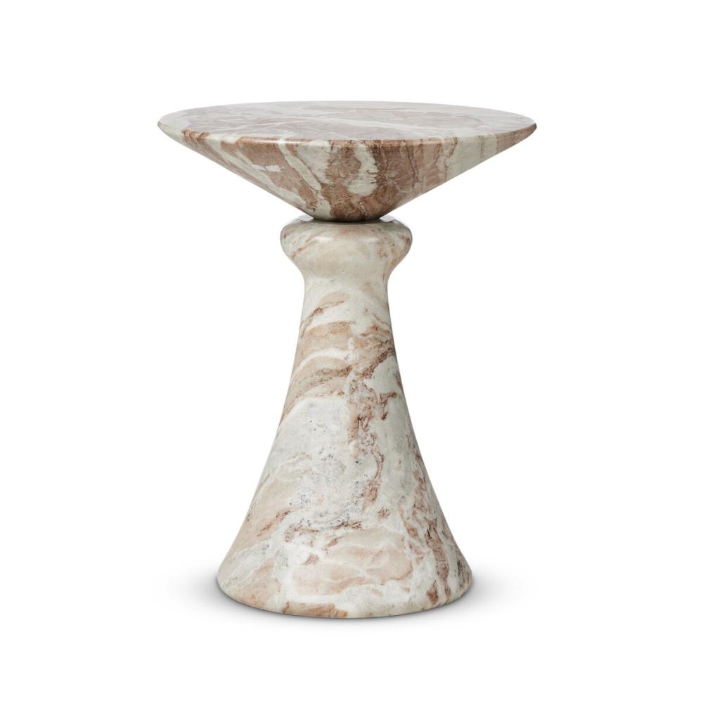 A sculptural end table of light brown, beige, and cream Sawar marble brings an extra surface to any space, while natural veining adds a look of beautiful movement.
