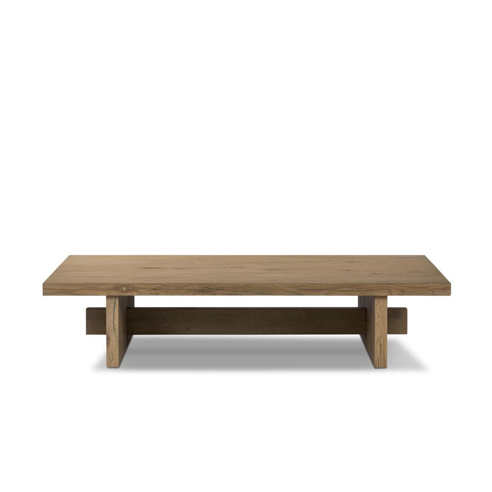 A substantially sized low profile coffee table of rubbed light oak features joint and connection construction for a design-forward look. Visible knots and graining add character. Measures 65"W × 14"H × 35"D.