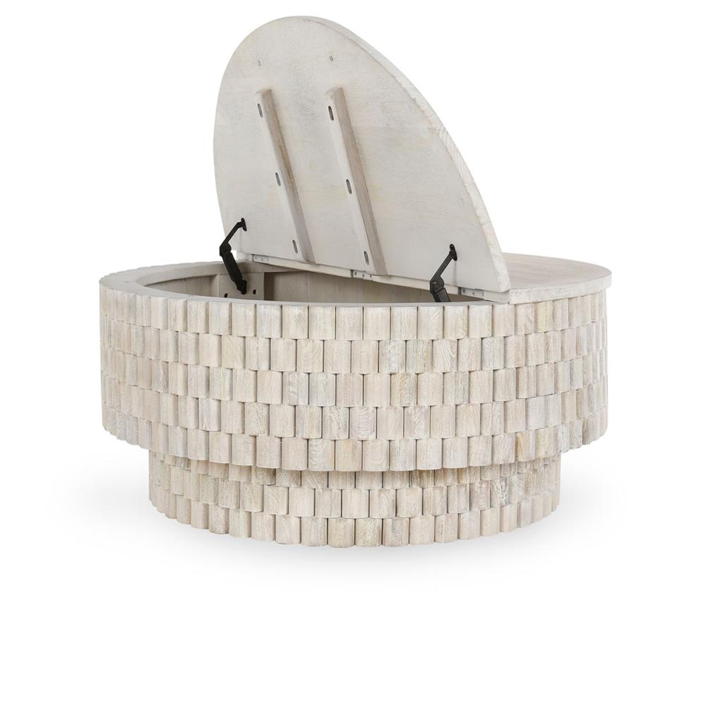 This modern coastal round coffee table features a lift top for storage. Crafted from mango wood with a white wash finish. Measures 18"H x 40"W x 40"D.