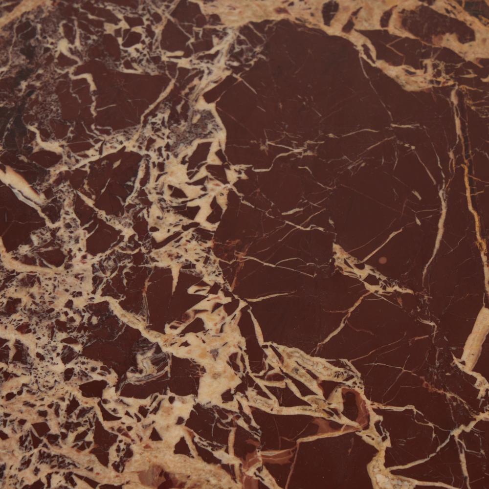 Shape and material share the spotlight in this tripod style coffee table of solid marble. With turned, pillar legs and a rich merlot finish, with dramatic natural veining. Sold as a set of two.