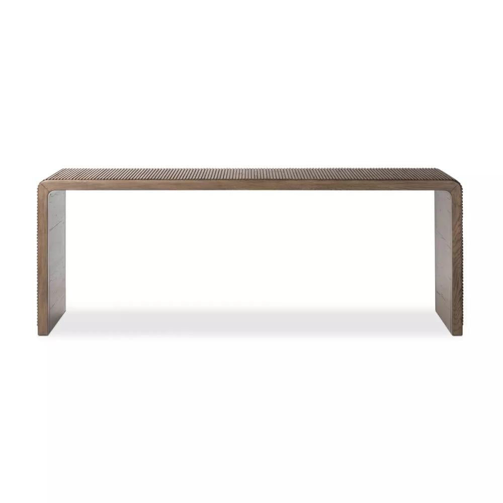 Grey finished oak wood shapes an elongated console table, rich with reeding. Subtly rounded edges reflect Brazilian midcentury inspiration behind this crafted minimalist piece. Designed in partnership with longtime Four Hands collaborator Thomas Bina and designer Ronald Sasson. Measures 30"H x 80"W x 22"D.