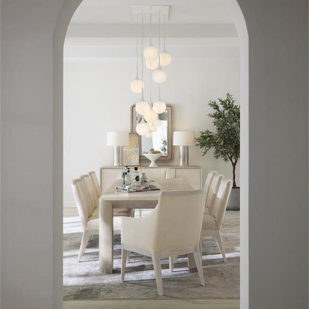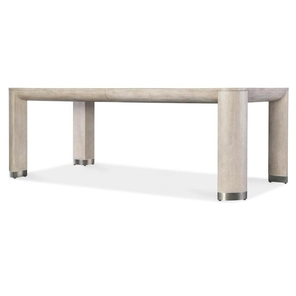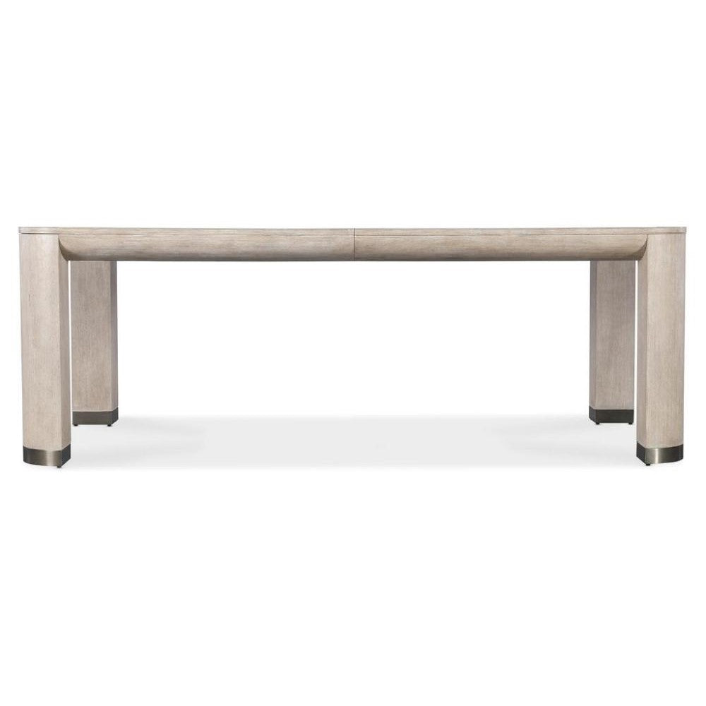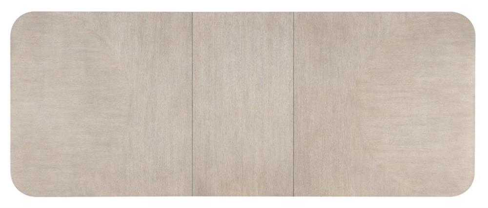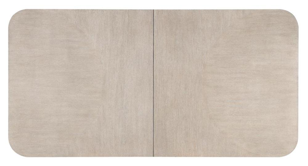 Inspired by decades of design movements with an unmistakably modern aesthetic that transcends time, this modern dining table is a striking, softly sophisticated profile. Featuring a rounded table apron and corners, matched veneers on the top and metal banding accents on the legs in a warm pewter finish, it is crafted of quartered oak veneers in a diamond finish with crystal-like alabaster hues. With one 24-inch leaf, the table extends up to 110 inches long. Measures 86"W × 44"D × 30"H.