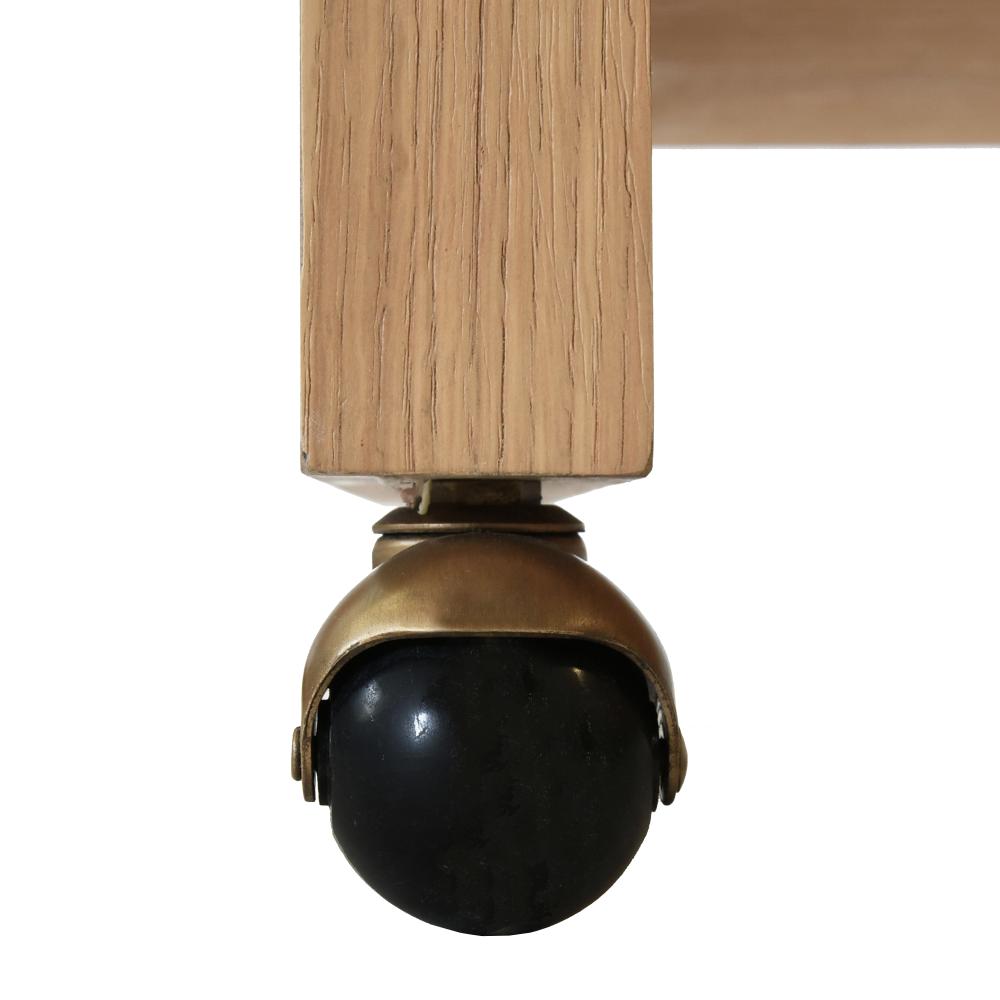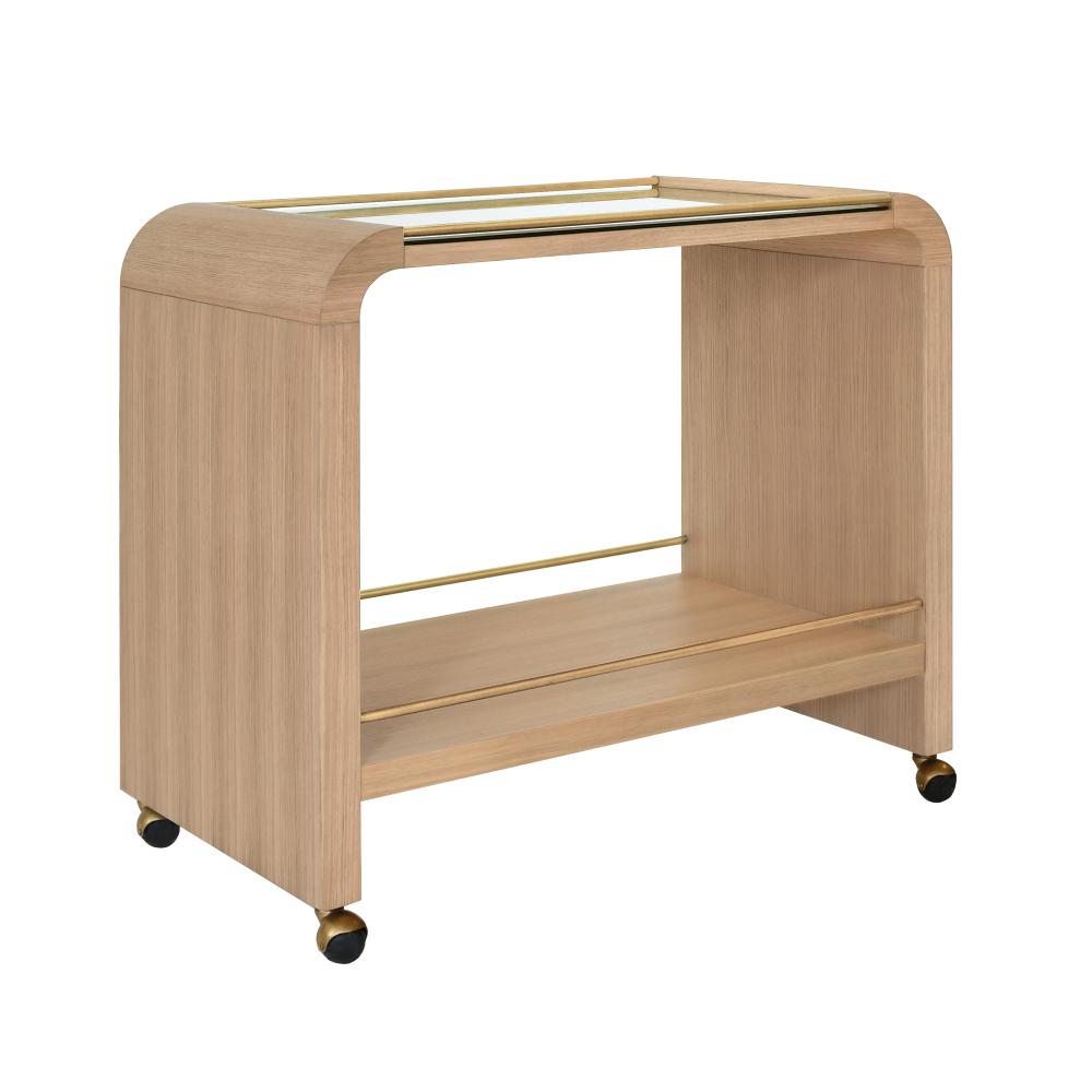 This modern curved top waterfall edge natural oak wood bar cart is adorned with antique brass rails. It's the perfect addition for entertaining guests or simply displaying your favorite beverages. Wood has natural variations and may differ slightly between panels.