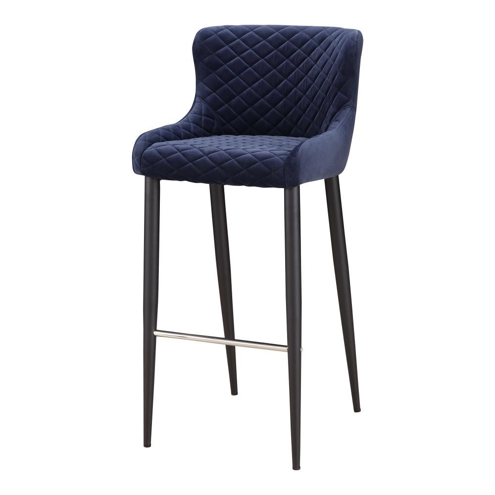 This modern barstool features a wide, comfortably padded seat with stunning diamond tufted blue velvet upholstery. A sleek steel base with footrest ensures maximum comfort. Measures 41"H x 18"W x 21.50"D.