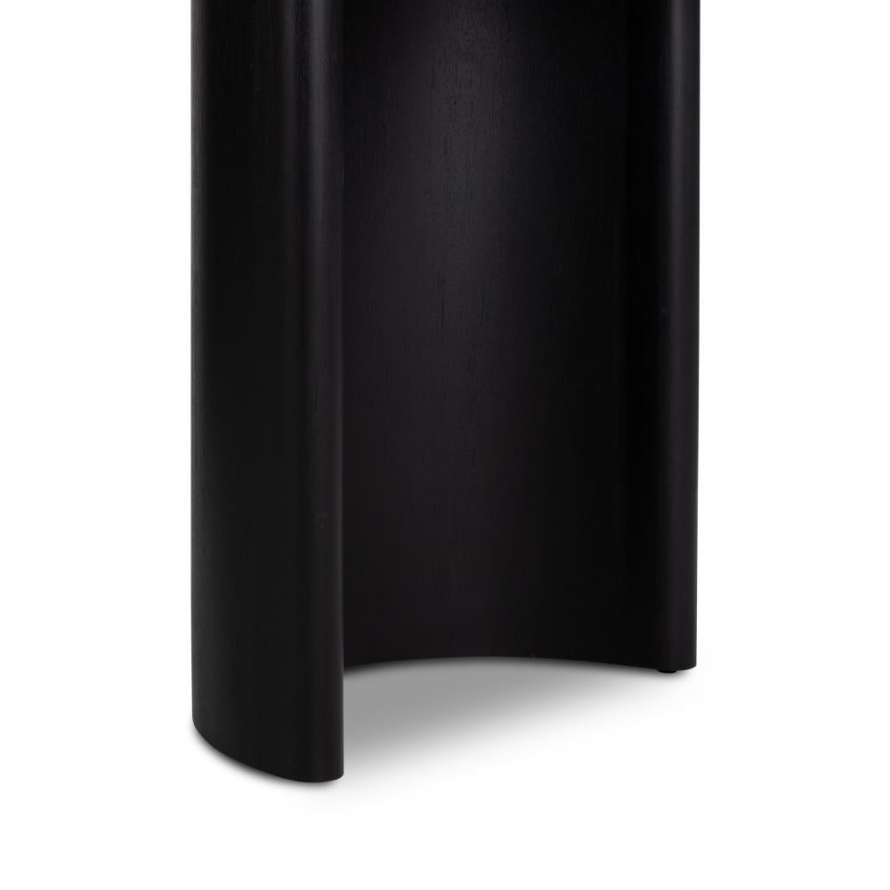 A study in shape. Black acacia wood forms crescent shaped legs and a sprawling oval tabletop, bringing grand, organic infused presence to the dining room. Crafted from solid Acacia wood and Acacia veneer. Seats 8–10 people.