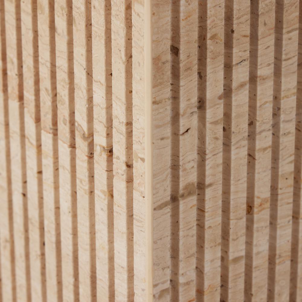 Solid marble and white oak wood fuse for a monochromatic look inspired by 1970s architecture. Linear rib detailing bring texture to a simple double pedestal base. Seats eight comfortably.