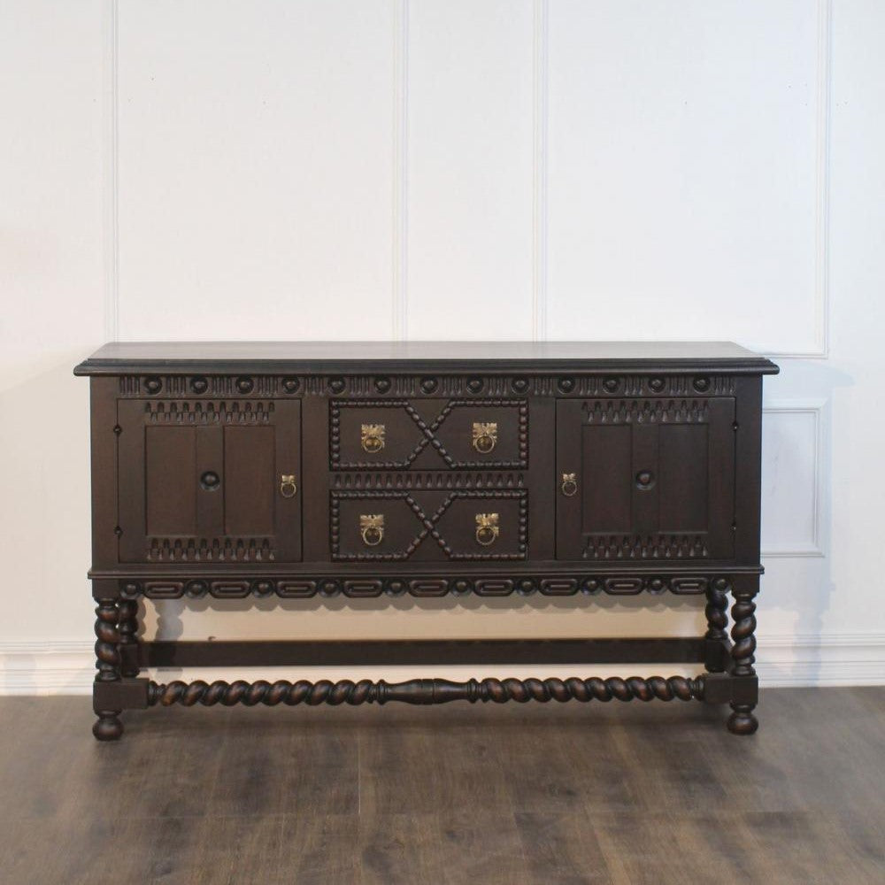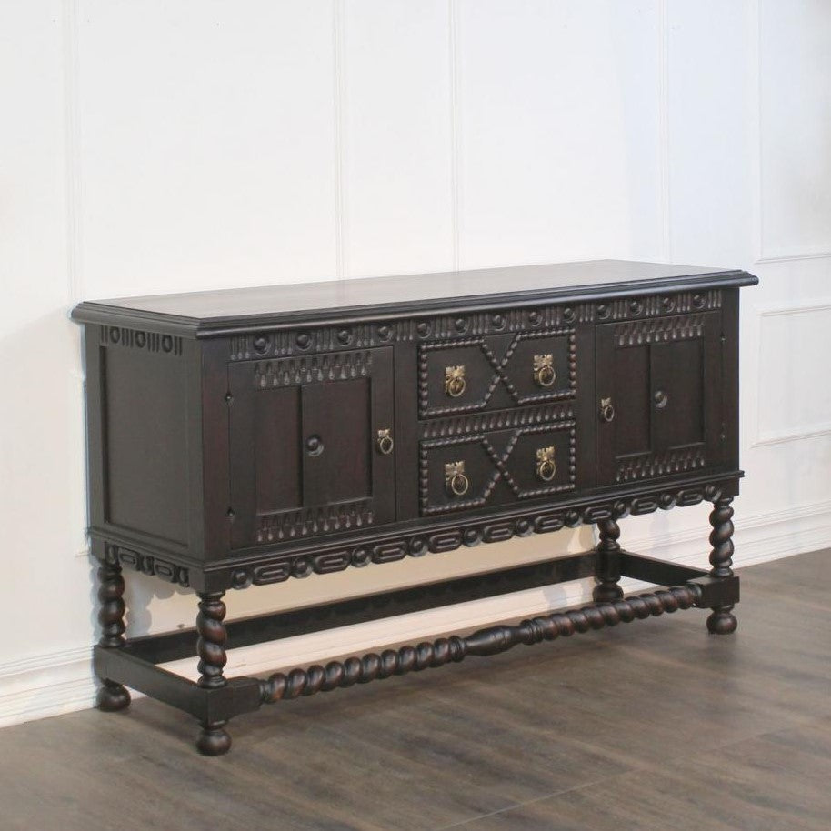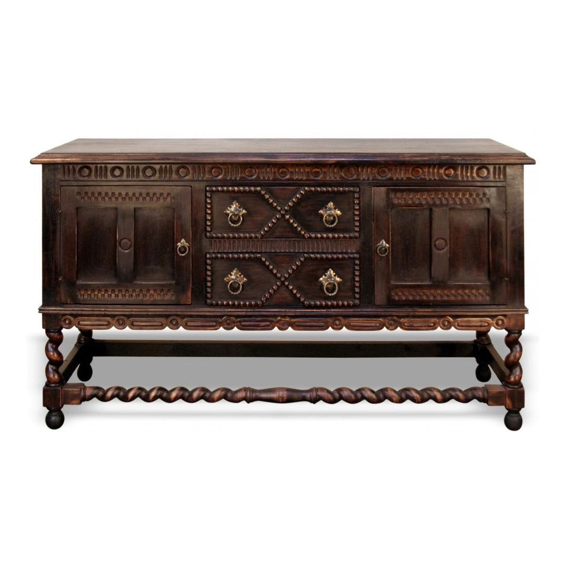 This traditional Spanish design sideboard cabinet was inspired by genuine antique consoles. It features beautiful hand carved details and hand turned legs. Versatile use for dining room, living room or foyer.