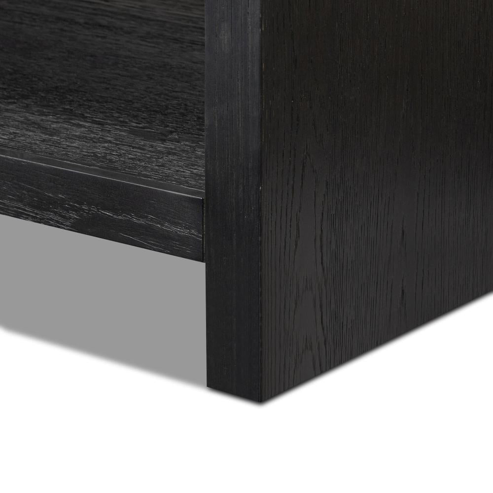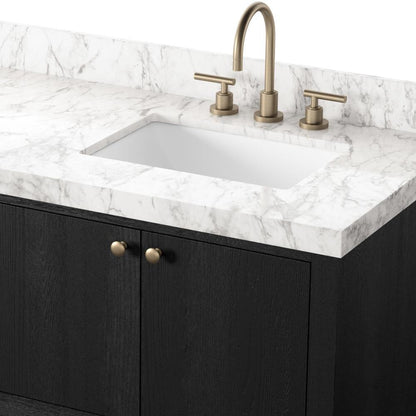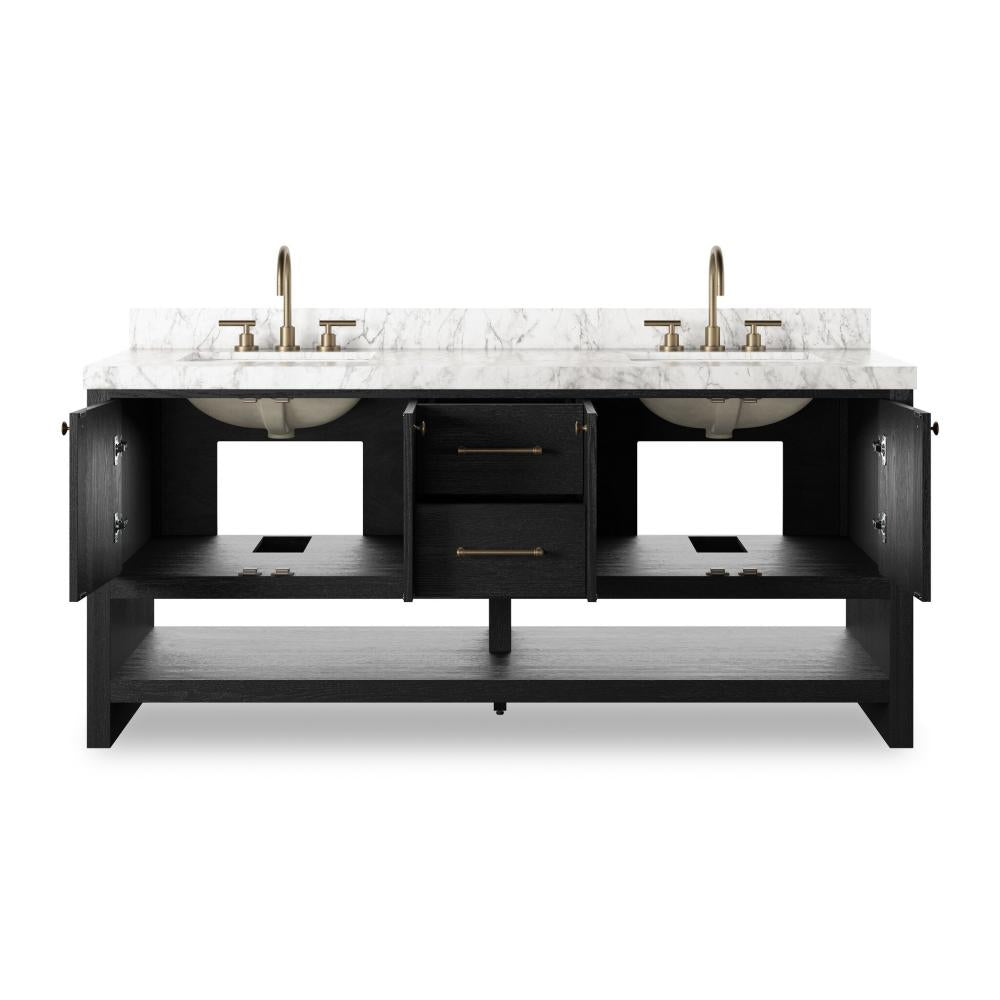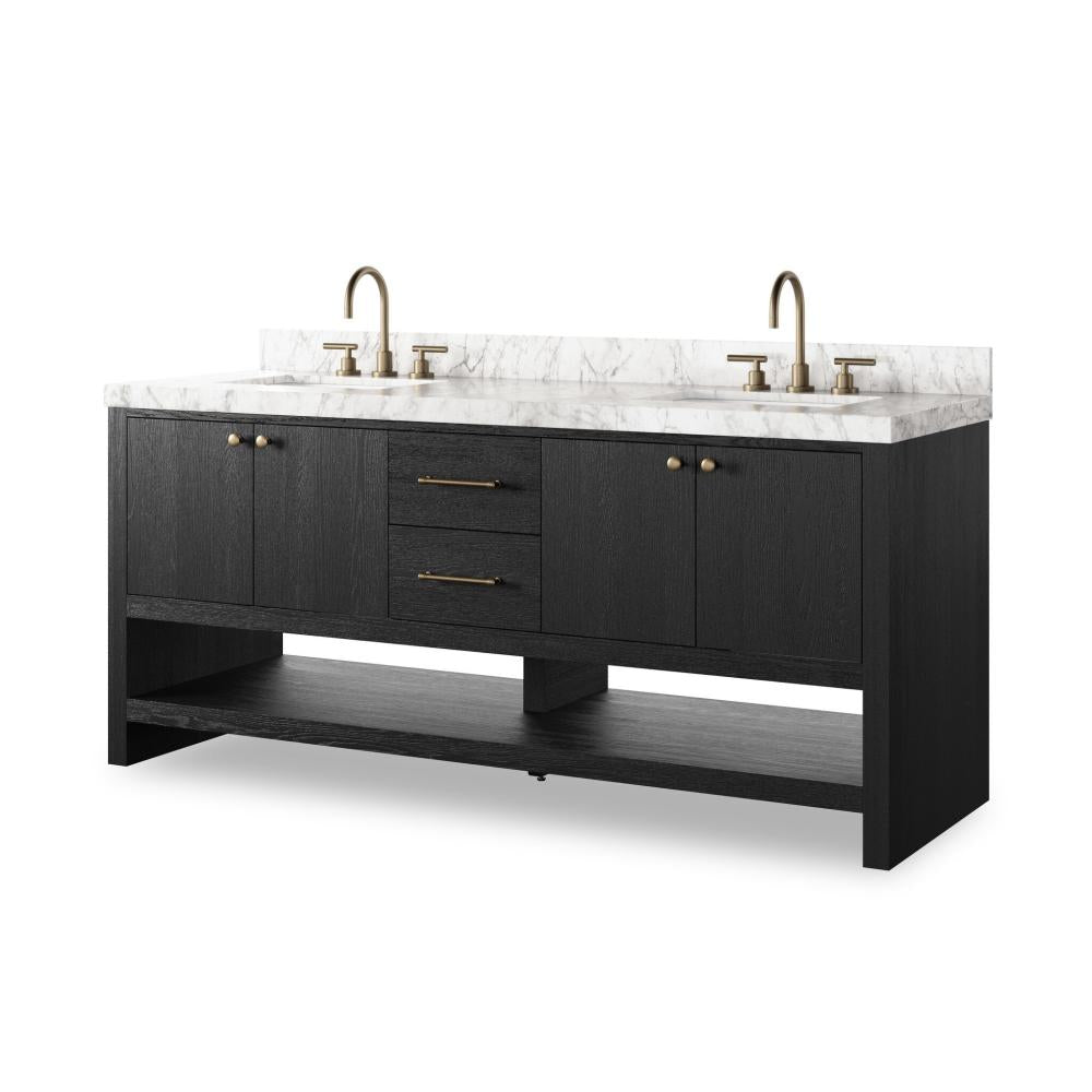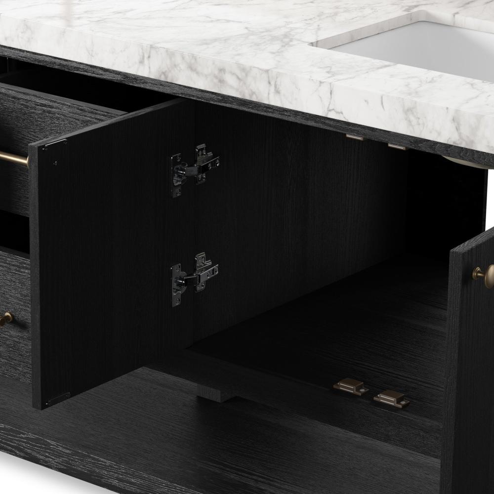 Set the tone for a calming, peaceful space with this simple, yet spacious design. Crafted with a wire-brushed, thick oak veneer base in a black finish for added character, a Carrera marble top and solid brass hardware. A mix of drawers, cabinets and open shelving offers a variety of storage and styling options.