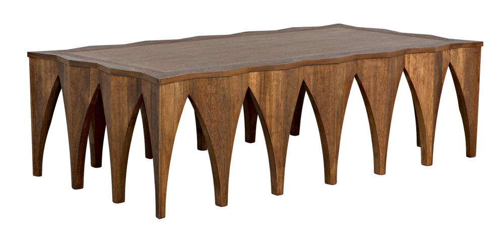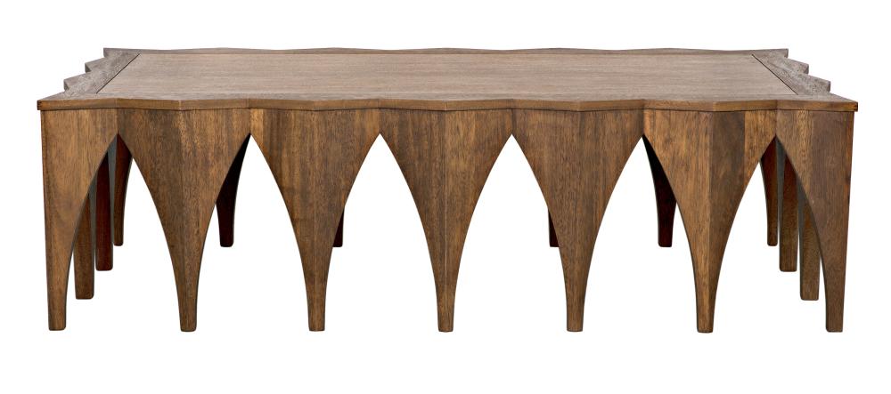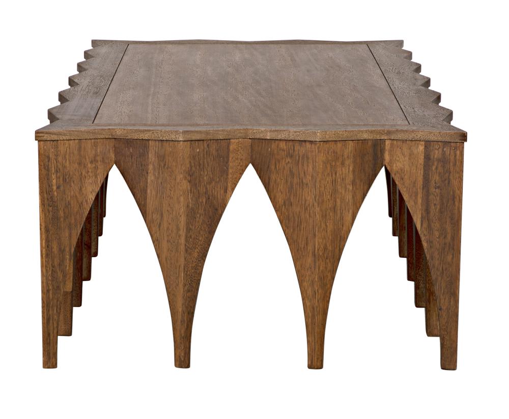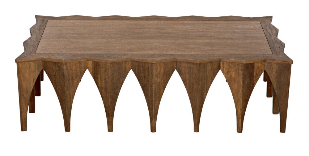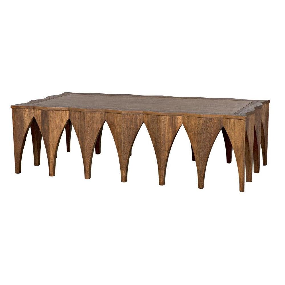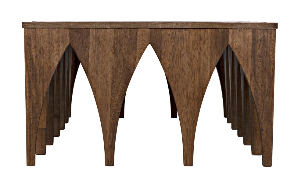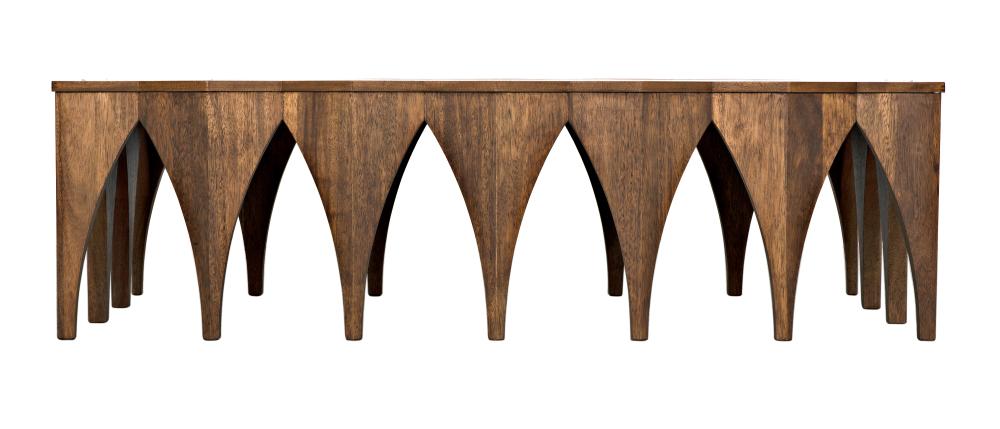 Beautifully hand crafted from walnut wood, this coffee table features gothic arch cut outs and a dark walnut finish. Measures 62"W × 18"H × 32"D.
