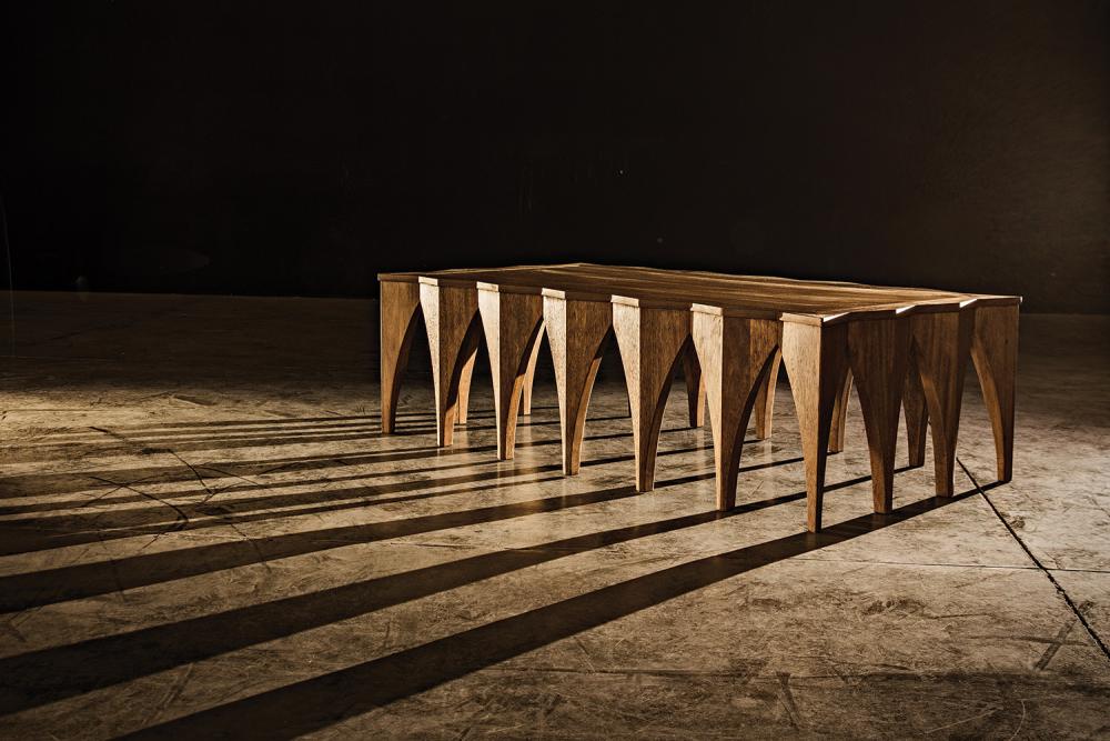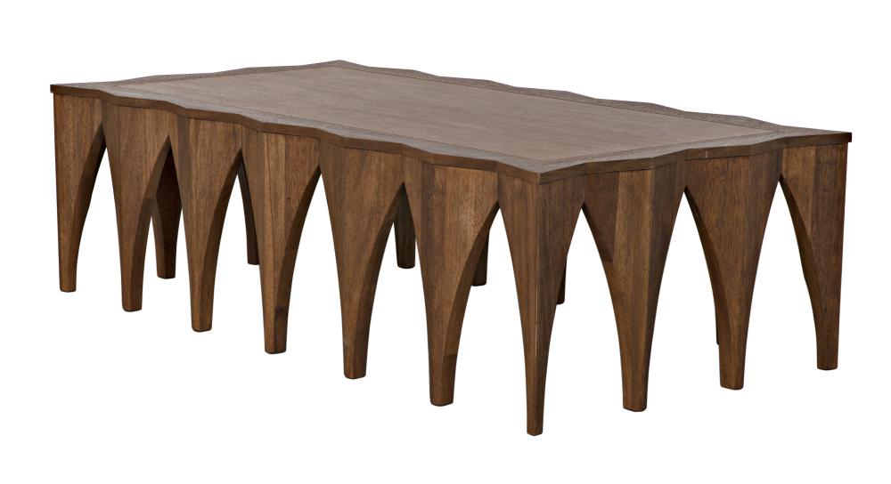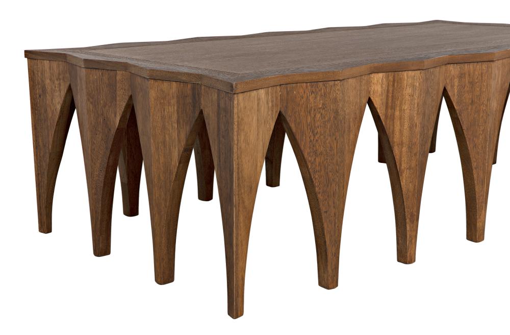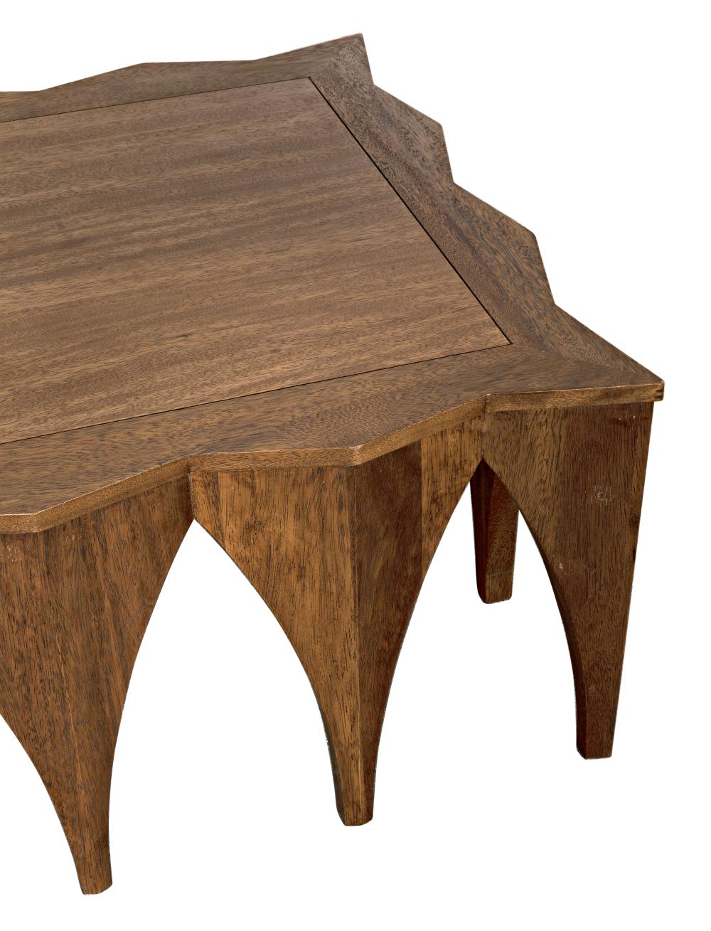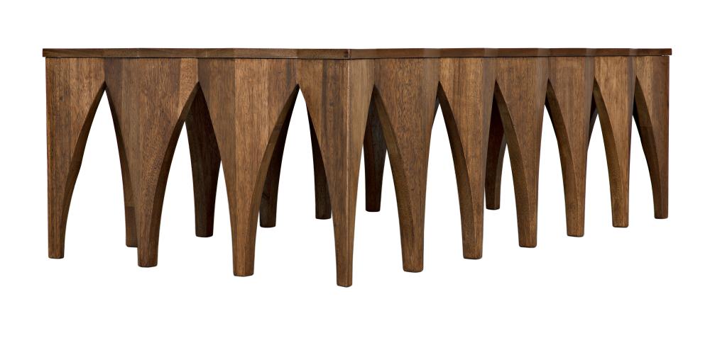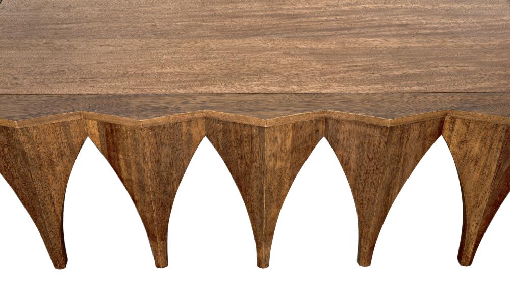 Beautifully hand crafted from walnut wood, this coffee table features gothic arch cut outs and a dark walnut finish. Measures 62"W × 18"H × 32"D.